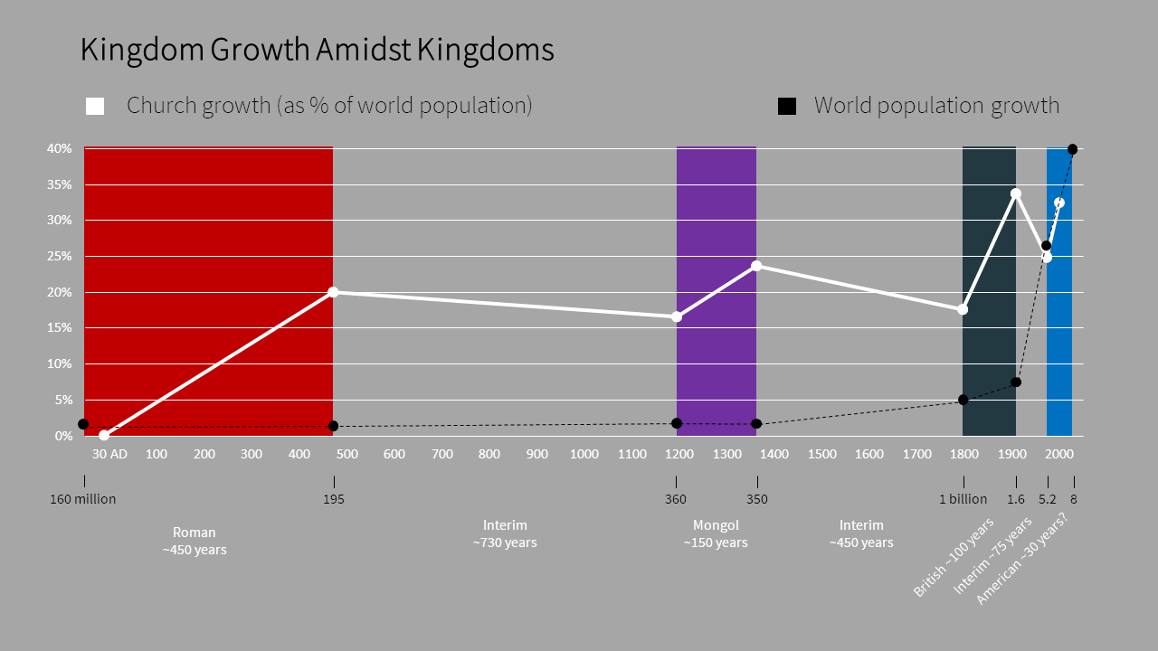 We see the interplay between these kingdoms and The Kingdom clearly in history. When Rome was the unipolar power, the Church grew to 20% of the world’s population. When Rome collapsed in 476 AD, the Church contracted to 17%. It remained dormant and in decline for over 700 years of multipolar and bipolar seasons until the Mongolian Empire came along. Then in that roughly 150 year unipolar season, the church grew from 17% to 24% of the world population. When the Mongolian Empire fell, the Church dropped from 24% to 18% during another nearly 450 years of multipolar and bipolar seasons. Then finally the British Empire emerged and established another 100 years of peace, and with it, another season of massive Church growth from 18% to 34% of the world’s population. That growth ended with World War I as the British unipolar season ended and yet another multipolar season came upon us. Enduring two World Wars (multipolar) and then the Cold War (bipolar), the Church contracted from 34% to 25% of the world’s population. But then the USSR collapsed, ending the bipolar season and America emerged the next world superpower. The Church then absolutely exploded from 25% to 33% of the world’s population in just 10 years. What is so remarkable about this unipolar season is that the world population increased dramatically. So while during the last unipolar season under the British Empire the Church was 34% of the world population, that total number was around 550 million believers. During the American unipolar season, while only growing to 33% thus far, that number jumped to over 2 billion believers—nearly a four-fold increase. This numerical growth in a single decade added more people to The Kingdom than all the rest of church history combined.
