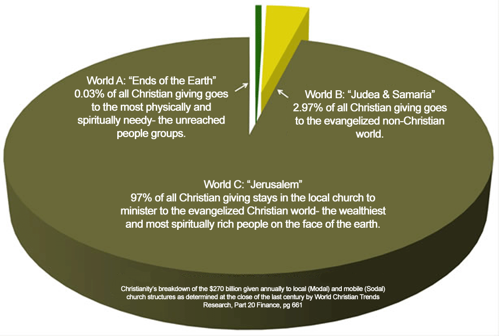 The sad reality is that most Christians don't tithe. I've heard many arguments and sermons about this over the years and I'm not legalistic about it, but there's a strong biblical case for 10% and an even stronger church tradition of it. As pastors are very aware that their members are not practicing this biblical principle and many local churches struggle financially, I can understand why some pastors would get a bit prickly when I say church members should be channeling funds to missions. Most pastors, due to them being raised in Protestant churches and trained in Protestant Bible schools and seminaries, do not acknowledge the legitimacy of the mobile church and therefore believe the full 10% tithe should be given to the local church. Anything above and beyond that they're usually fine with church members giving wherever they please. I would agree with that model if local churches were universally partnered with mobile churches and corporately giving a significant portion of that tithe to the field... But they aren't. So when the original intent of the biblical concept of tithe was for the local church to wisely manage the corporate finances and fund missions breaks down and instead they're using most (if not all) of those monies to fund their own ministries, buildings and salaries, I can equally see the argument for church members giving a portion of their tithe to the local church and a portion to the mobile church at least until their local leaders do some course correction and re-prioritize their budgets. In the end I believe that's an issue of conscience that each believer should decide. The 10% is the minimum you should be giving, but how you divvy that up those funds or the maximum percentage you give is up to you. If you currently give a pittance to your local church though, I would advise you to increase your giving there as well as beginning to give to missions. Simply put, if all believers tithed and all local churches supported mobile churches, no pastor and no missionary would be in need and the ministry of both church structures would be amply funded. As it sits right now however there are many, many impoverished missionaries and sinfully underfunded missions ministries as shown in the chart below.