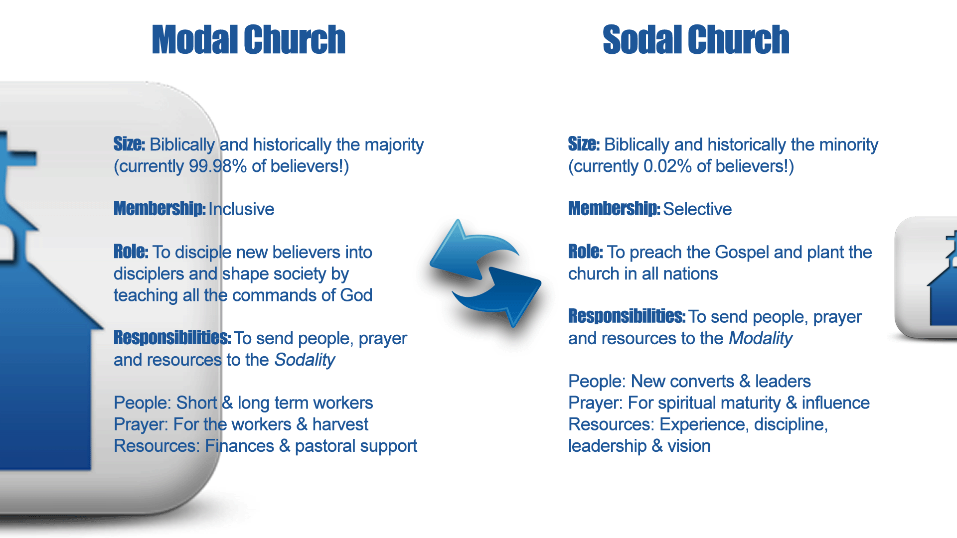 This is not to downplay the role of the local church or local church leaders whatsoever, but simply to re-emphasize the importance and inclusion of the mobile church as in Protestant Christianity it has been mislabeled, discredited and even ostracized by the the local church. When local church leaders classify the Sodality as "para-church organizations", they are either knowingly or unknowingly fostering an "us vs. them" mentality. There should be unity in the body of Christ and when the two structures of God's redemptive mission work together within their ordained roles and callings, the church fires on all cylinders and the Gospel goes out in power. So what are the respective characteristics, roles and responsibilities of the two structures of the church? Here's a brief overview: